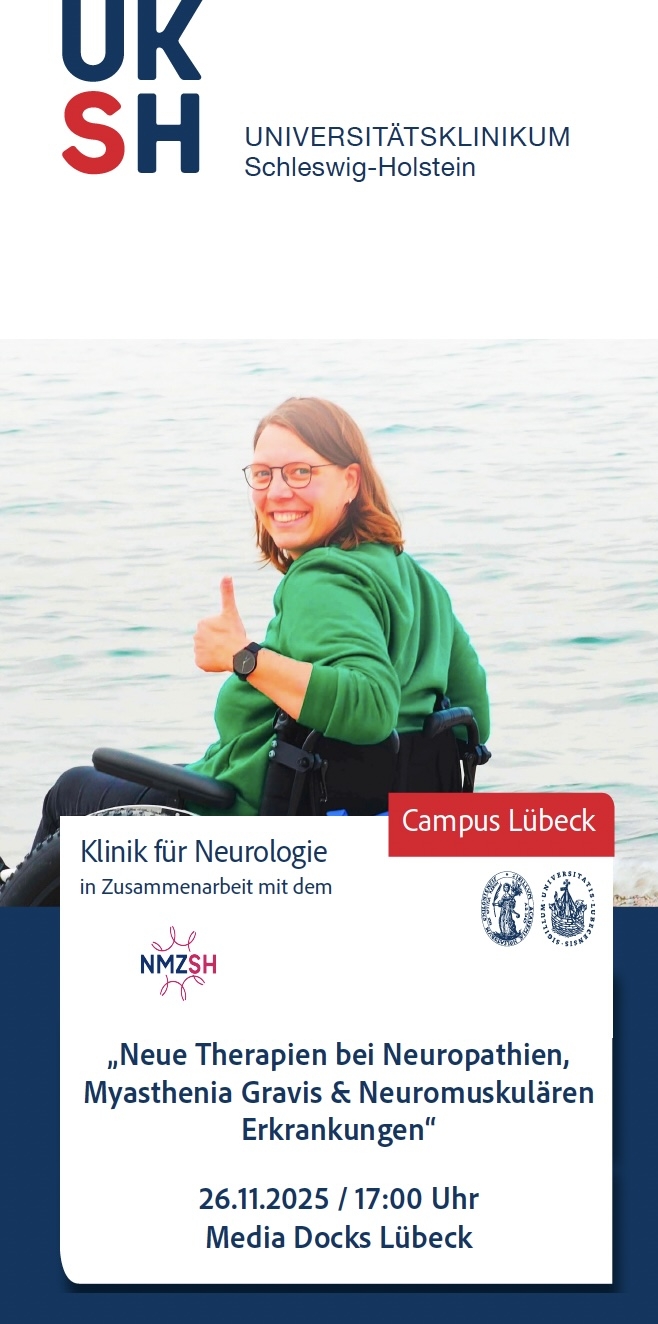 Liebe Kolleginnen und Kollegen, das Neuromuskuläre Zentrum Schleswig-Holstein und die Klinik für Neurologie am UKSH Lübeck möchten Sie herzlich einladen zu der Fortbildung „Neue Therapien bei Neuropathien, Myasthenia Gravis und Neuromuskuläre Erkrankungen“.